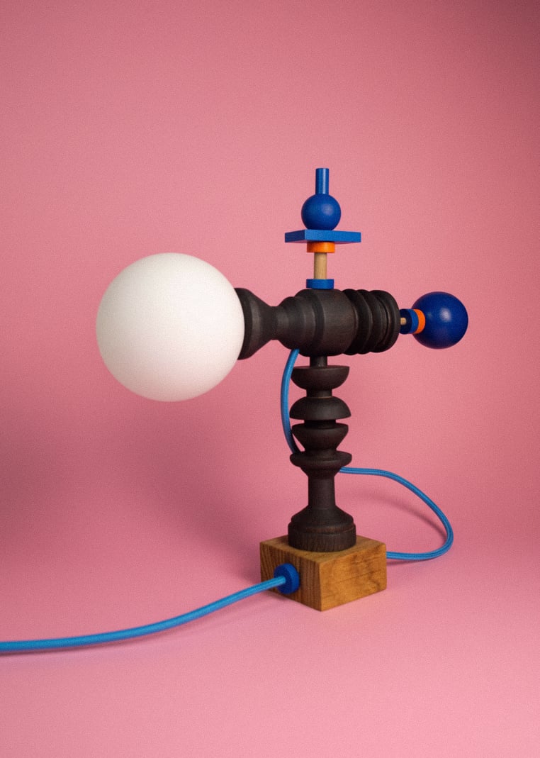 Lampe cinétique en bois tourné, équilibre précaire entre sculpture et jeu d'adresse. Formes empilées qui défient la gravité, câble bleu électrique qui serpente, globe opaline suspendu comme une lune capturée — un totem domestique qui refuse la fixité.